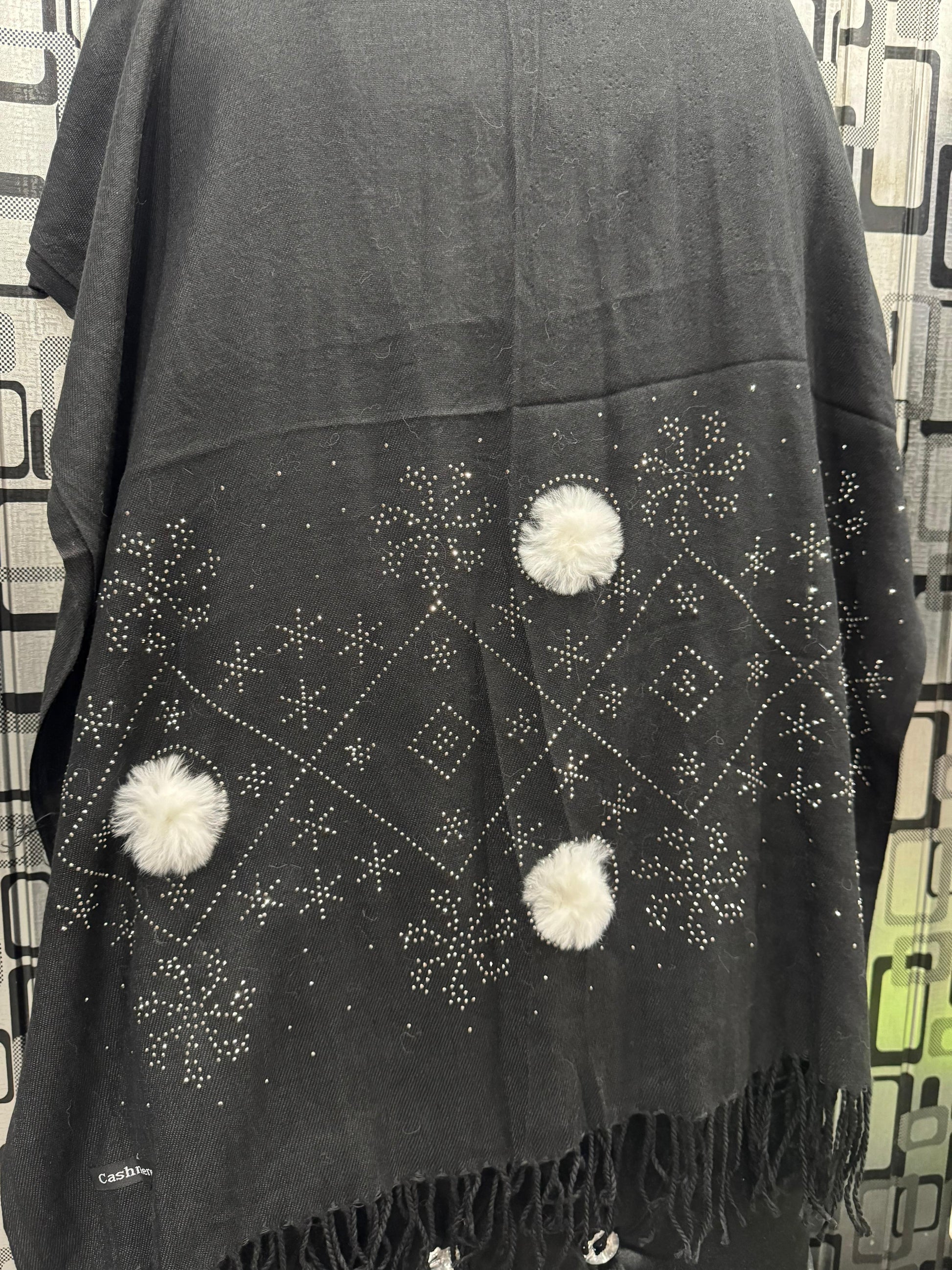 Wrap yourself in elegance with our Black Embellished Wool Scarf โ a perfect blend of warmth and glamour. This beautifully crafted scraf features intricate crystal work arranged in delicate geometric and floral patterns, enhanced by soft faux fur pom details that add a playful yet luxurious touch.
