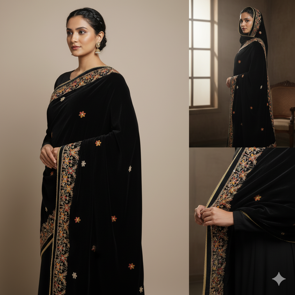Pairing: Drape over solid-color silk suits, sarees, or lehengas (especially black, gold, or colors matching the embroidery).